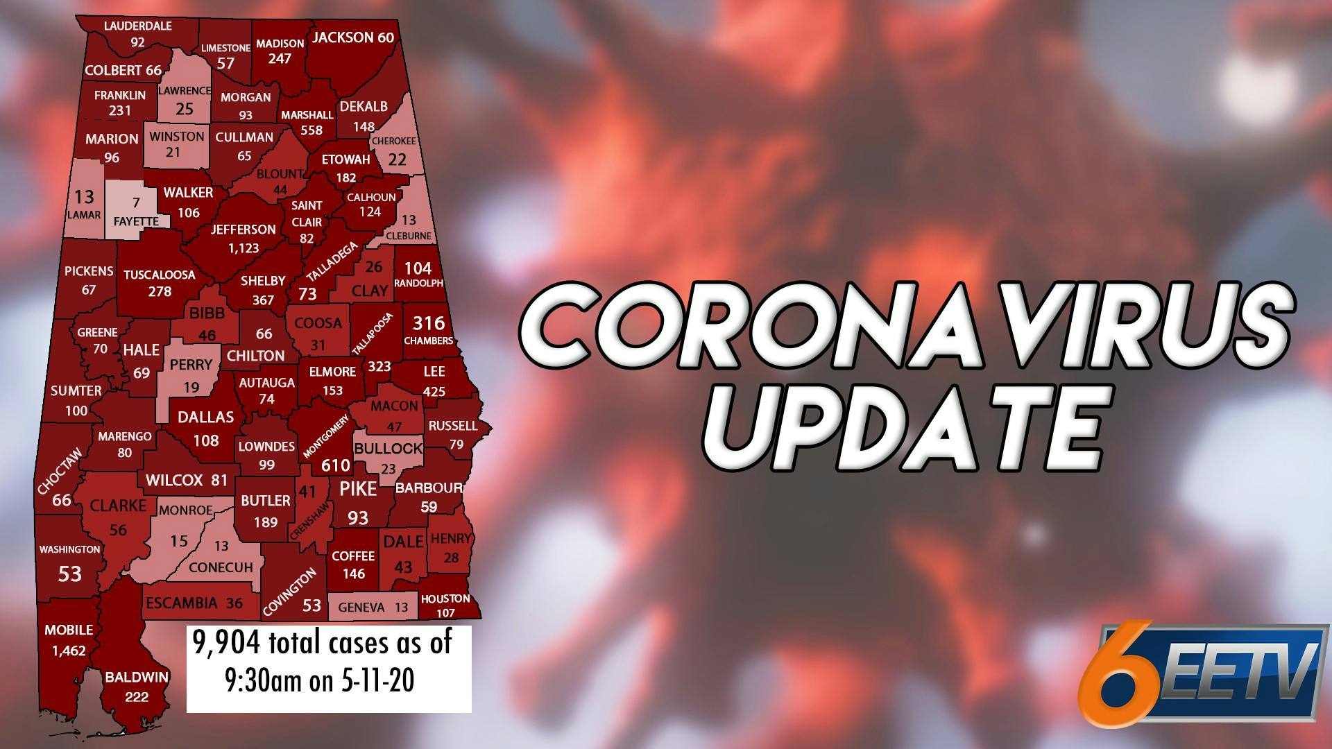 AUBURN, Ala. (EETV) - Update: Monday at 9:30am- The ADPH has confirmed 9,904 cases of COVID-19 in the state. Lee County has 425 cases. There are 393 confirmed deaths in the state. 129,426 people in the state have been tested and 1,245 people statewide have been hospitalized.